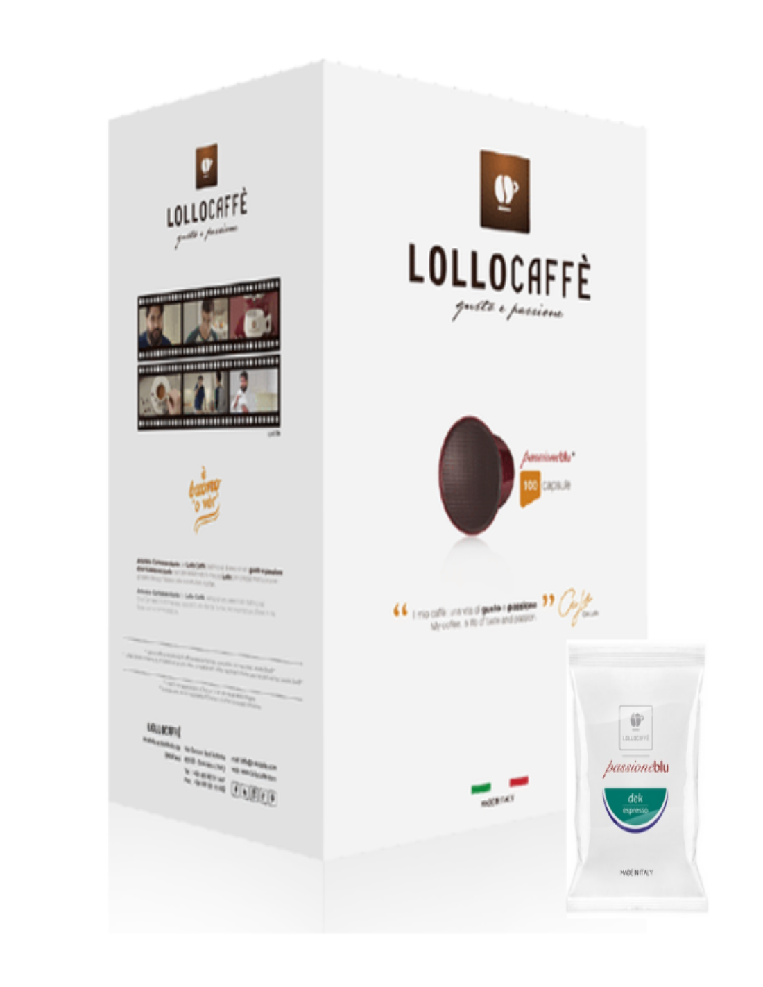 Box 100 Capsule PassioneBlu: gusta il sapore bilanciato e tipico del caffè Lollo nella sua miscela Dek Espresso. Compatibile con macchine Lavazza Blue