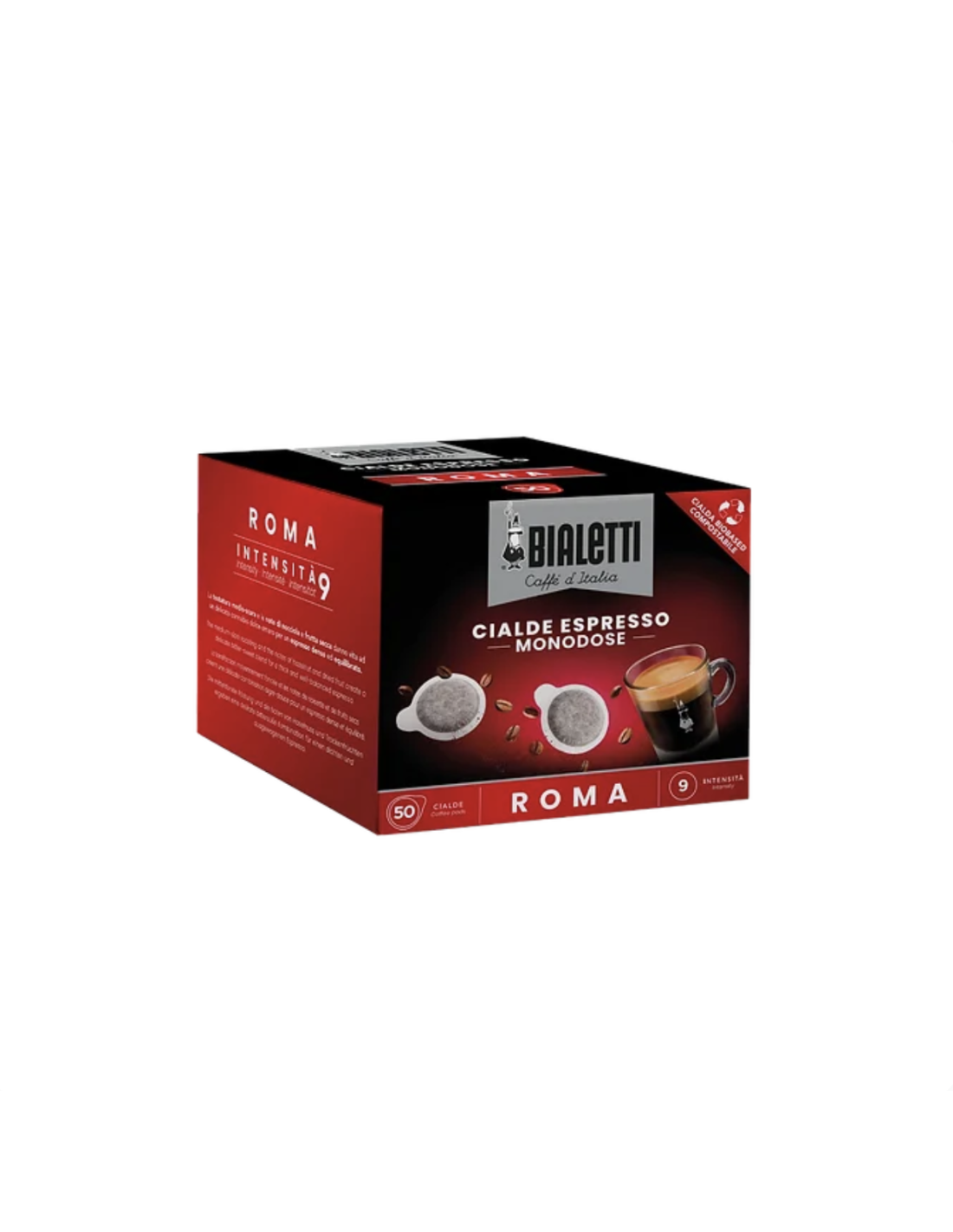 Le cialde Bialetti Roma racchiudono un caffè espresso equilibrato, dal gusto persistente. Un tributo alla tradizione gastronomica romana che affonda le radici in sapori decisi e sapidi che venivano mitigati, a fine pasto, proprio grazie al caffè. Il caffè perfetto dopo un buon pasto, ha una tostatura media che esalta le note di nocciola e frutta secca dando vita a un delicato connubbio dolce-amaro. Il box contiene 50 cialde Bialetti e ogni cialda, compostabile, 7 grammi di caffè.