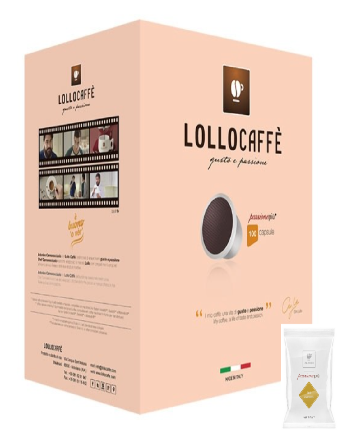 Box 100 capsule PassionePiù: formato compatibile per le macchine Uno System Indesit e Maranello, assapora in questo istante la miscela Oro Espresso di Lollo Caffè!